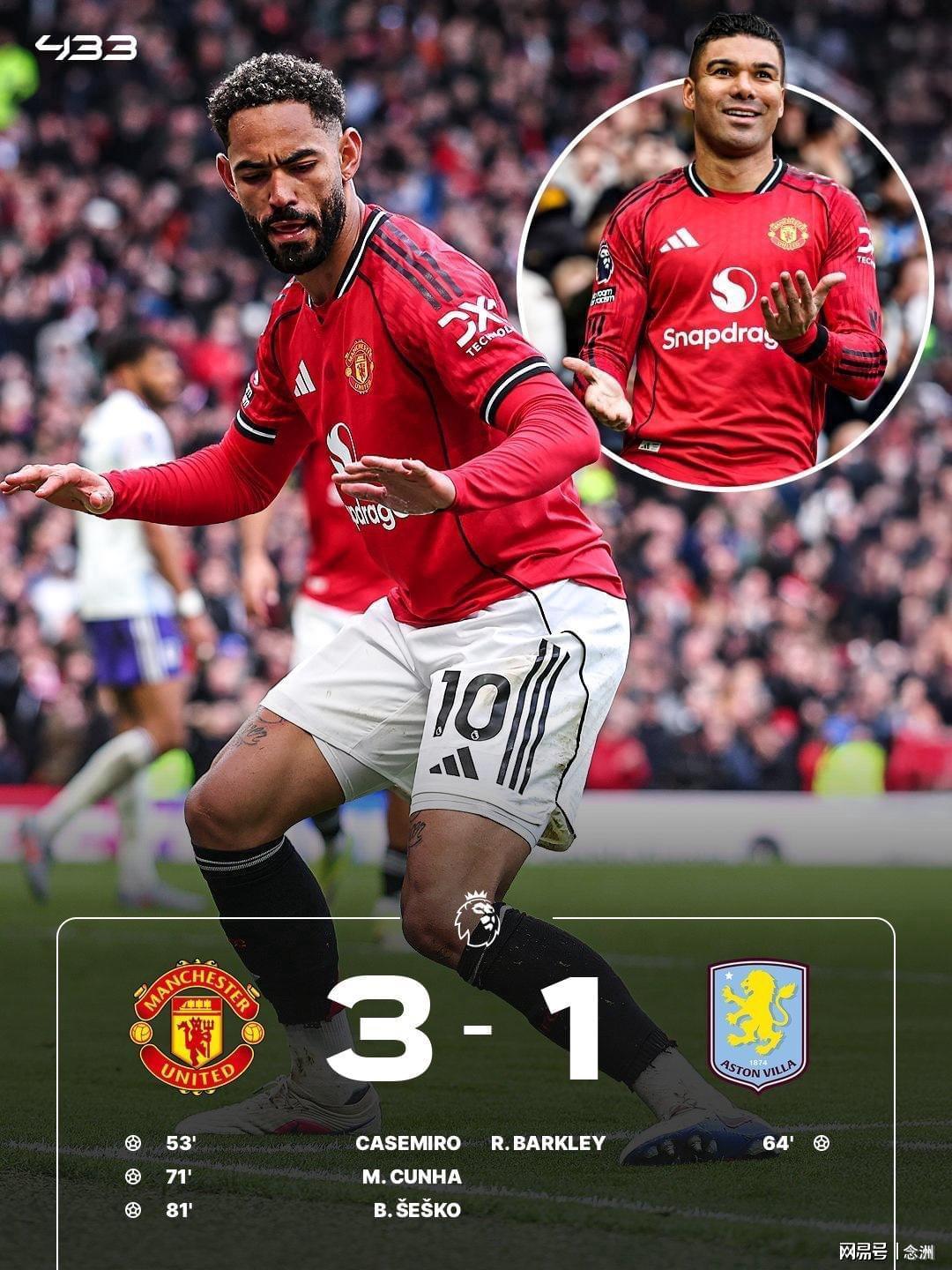 曼联主场3-1战胜阿斯顿维拉,稳居第3并扩大领先优势。大马丁屡次做出神扑,B费助攻卡塞米罗头球打破僵局,巴克利扳平比分,B费再次助攻,库尼亚破门,谢什科替补锁定胜局。