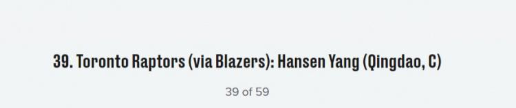 直播吧6月23日讯 Bleacher Report选秀专家Jonathan Wasserman今天更新了他的模拟选秀排名,其中杨瀚森在第39顺位被猛龙选中。